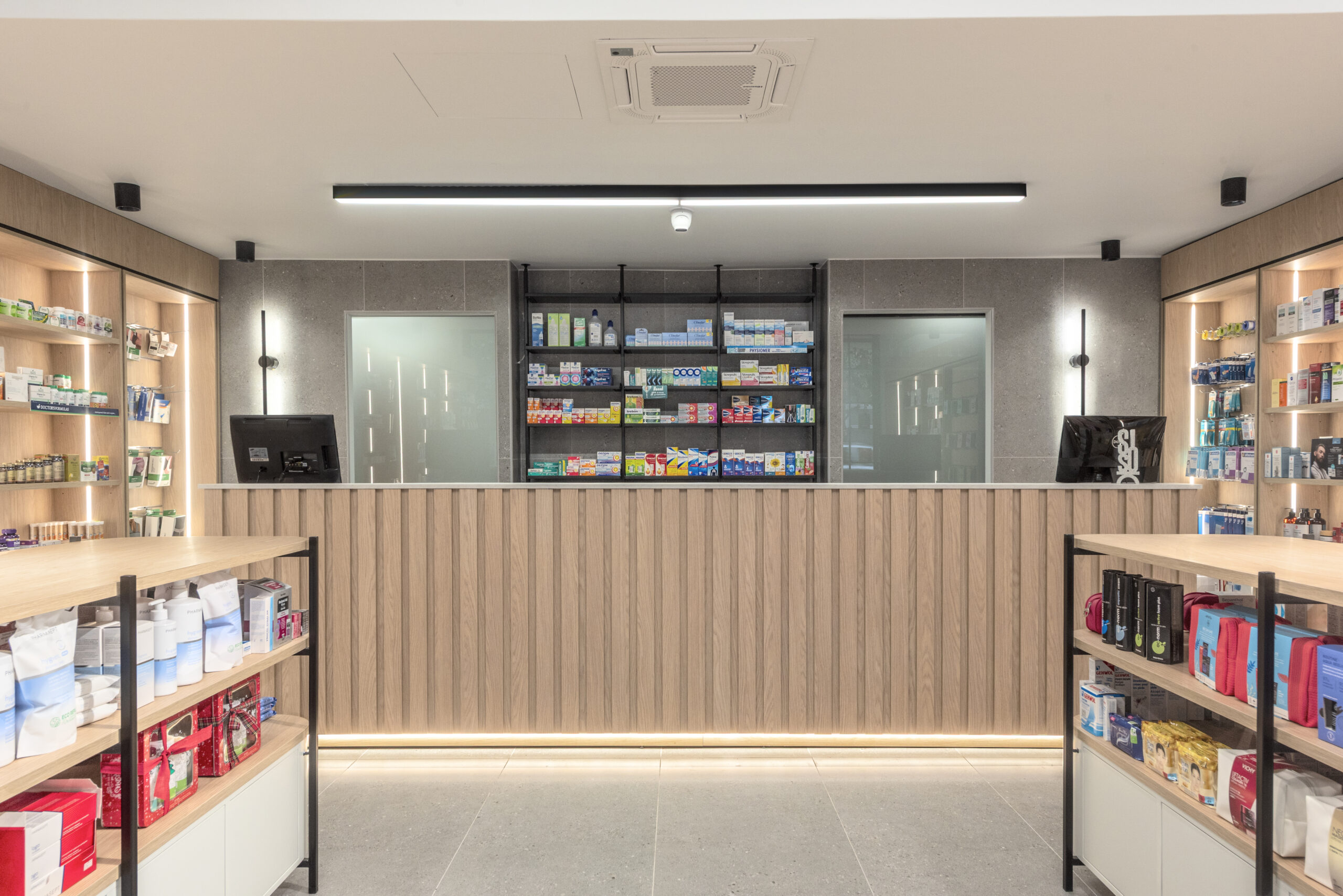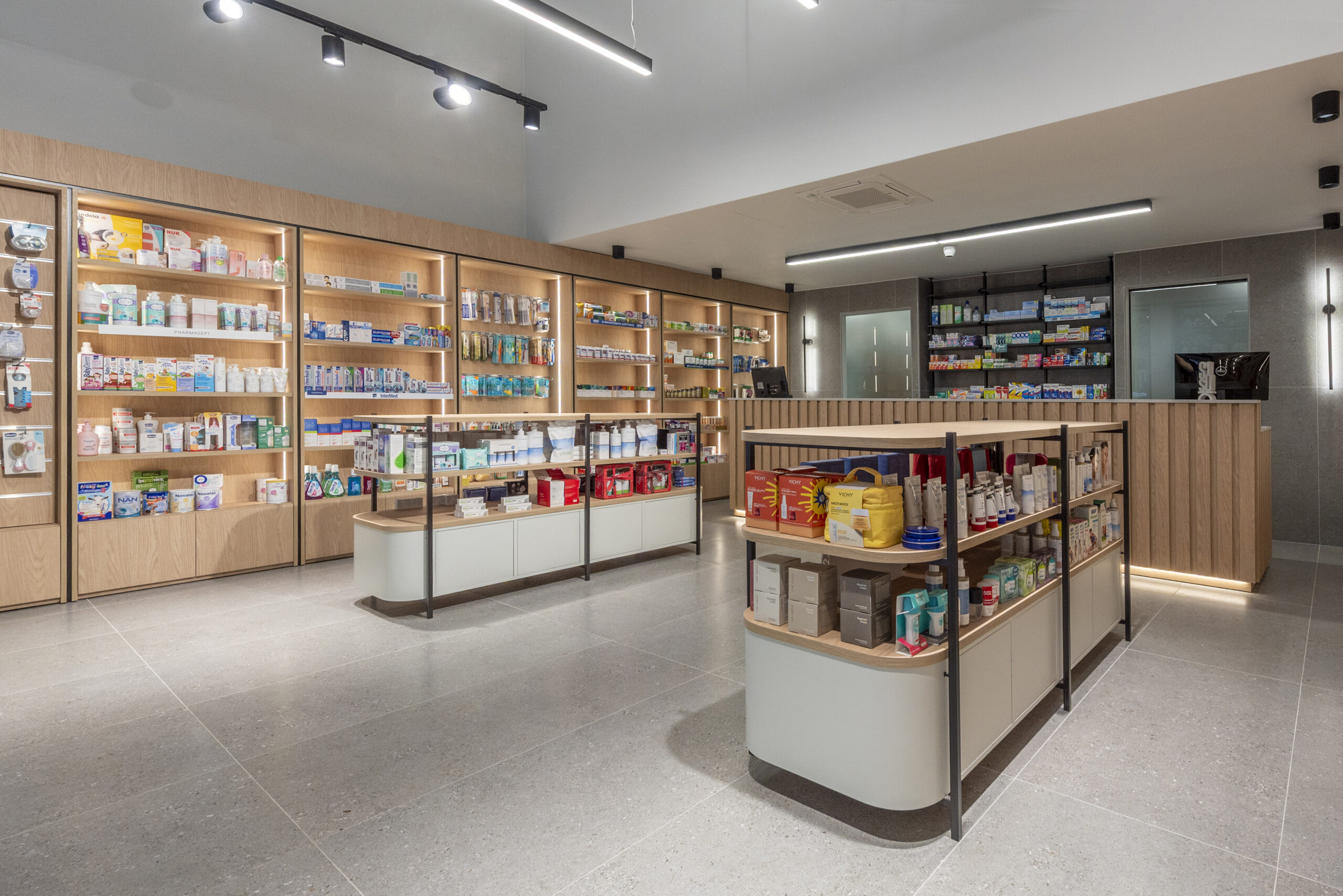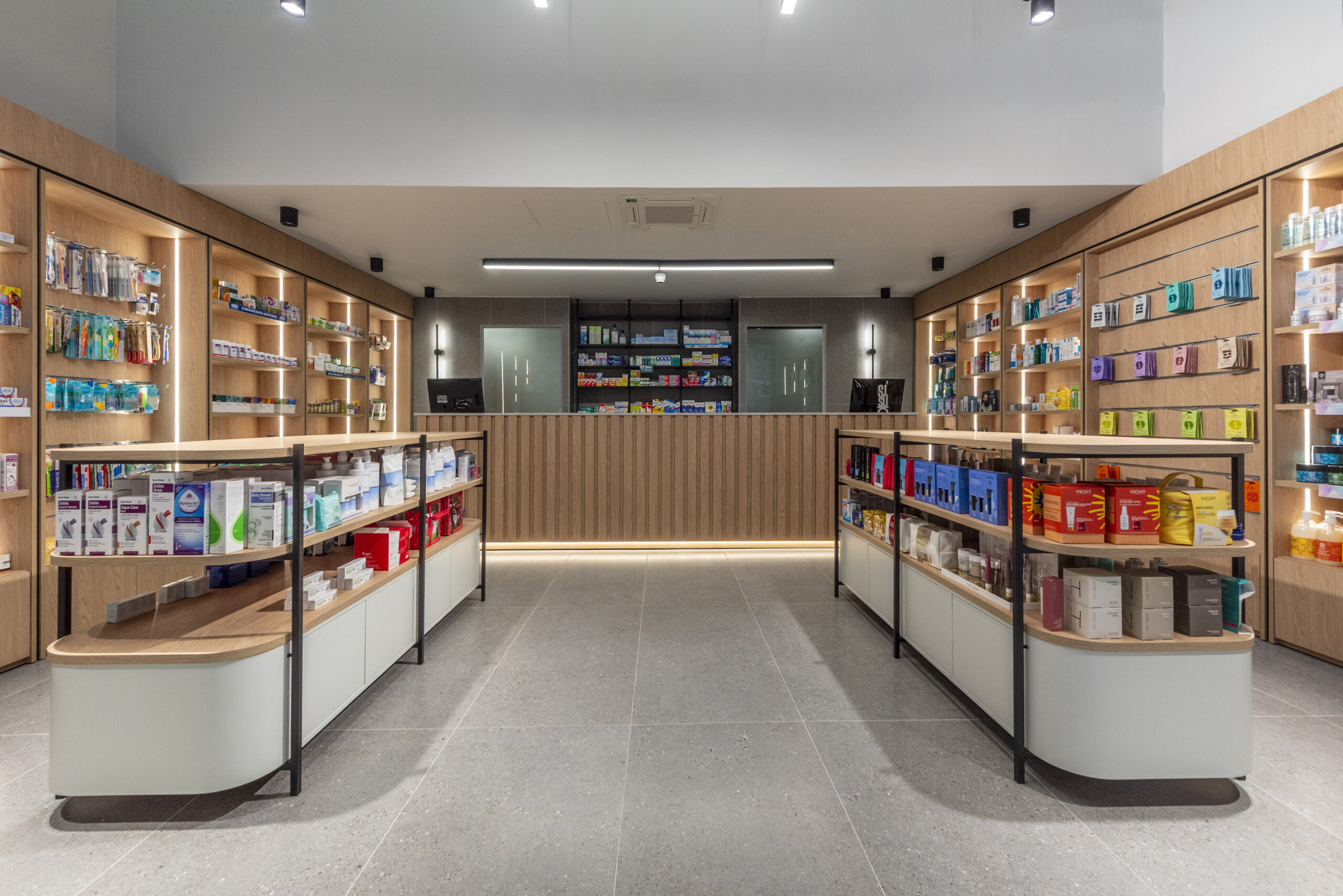 The result is a modern urban pharmacy — clear, timeless, and quietly refined — where architecture supports functionality while elevating the everyday user experience.
