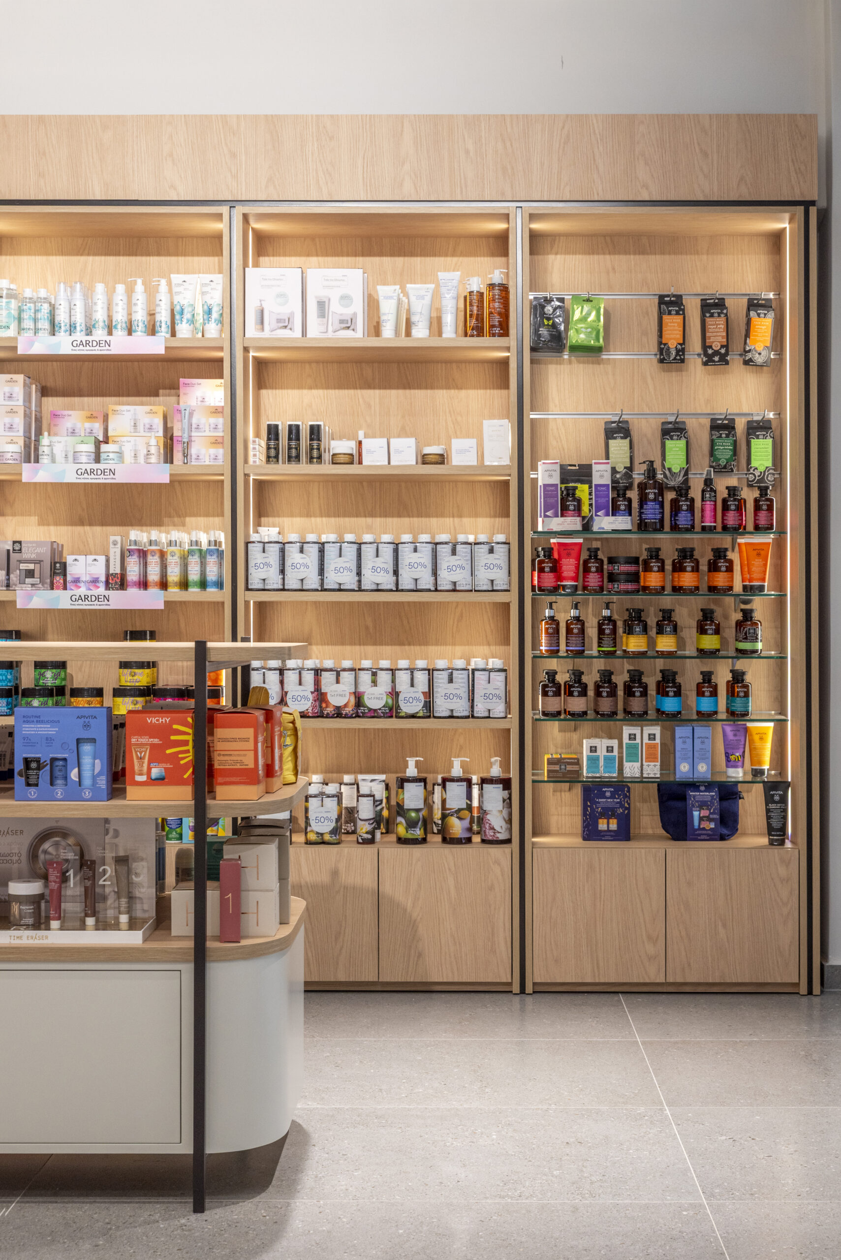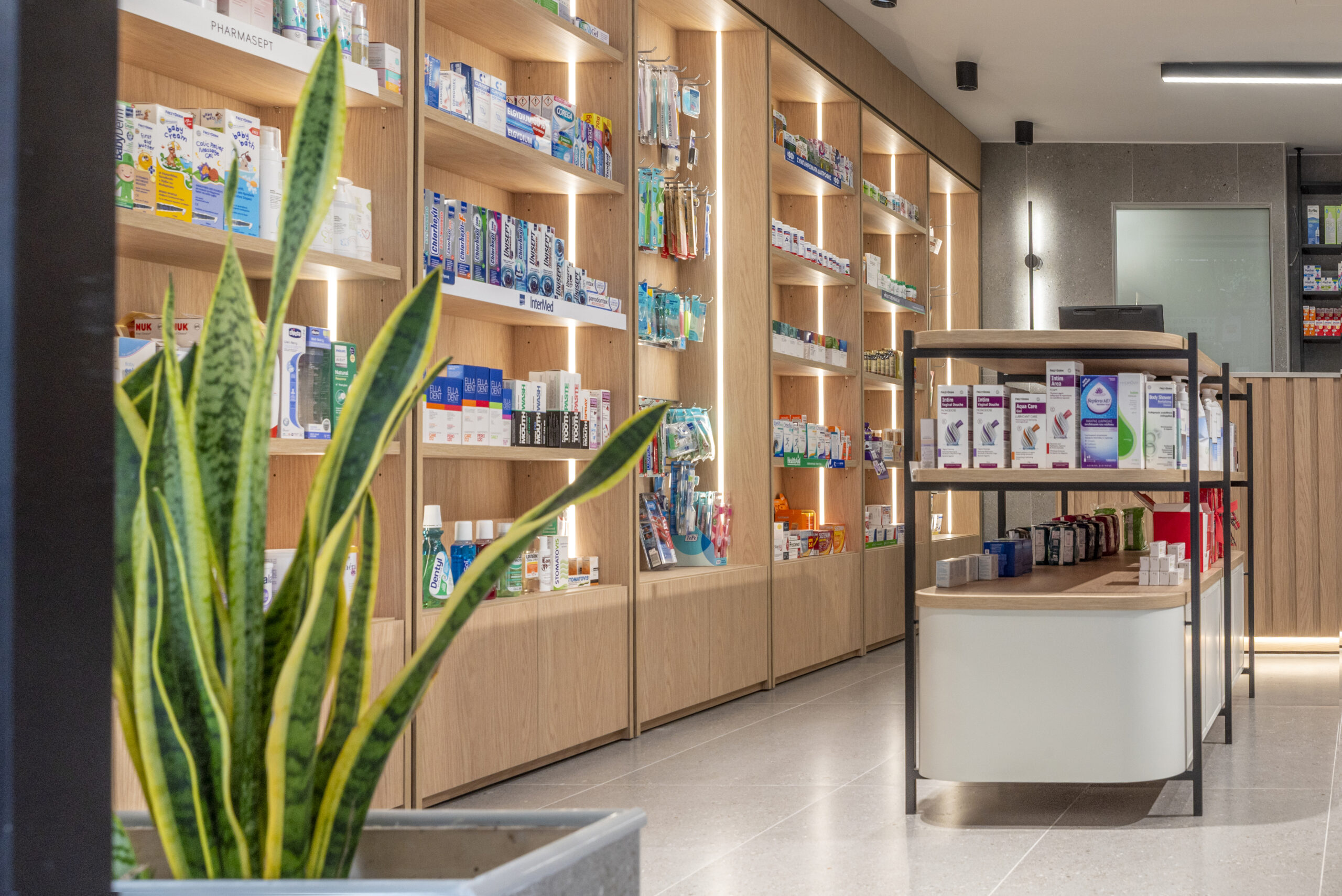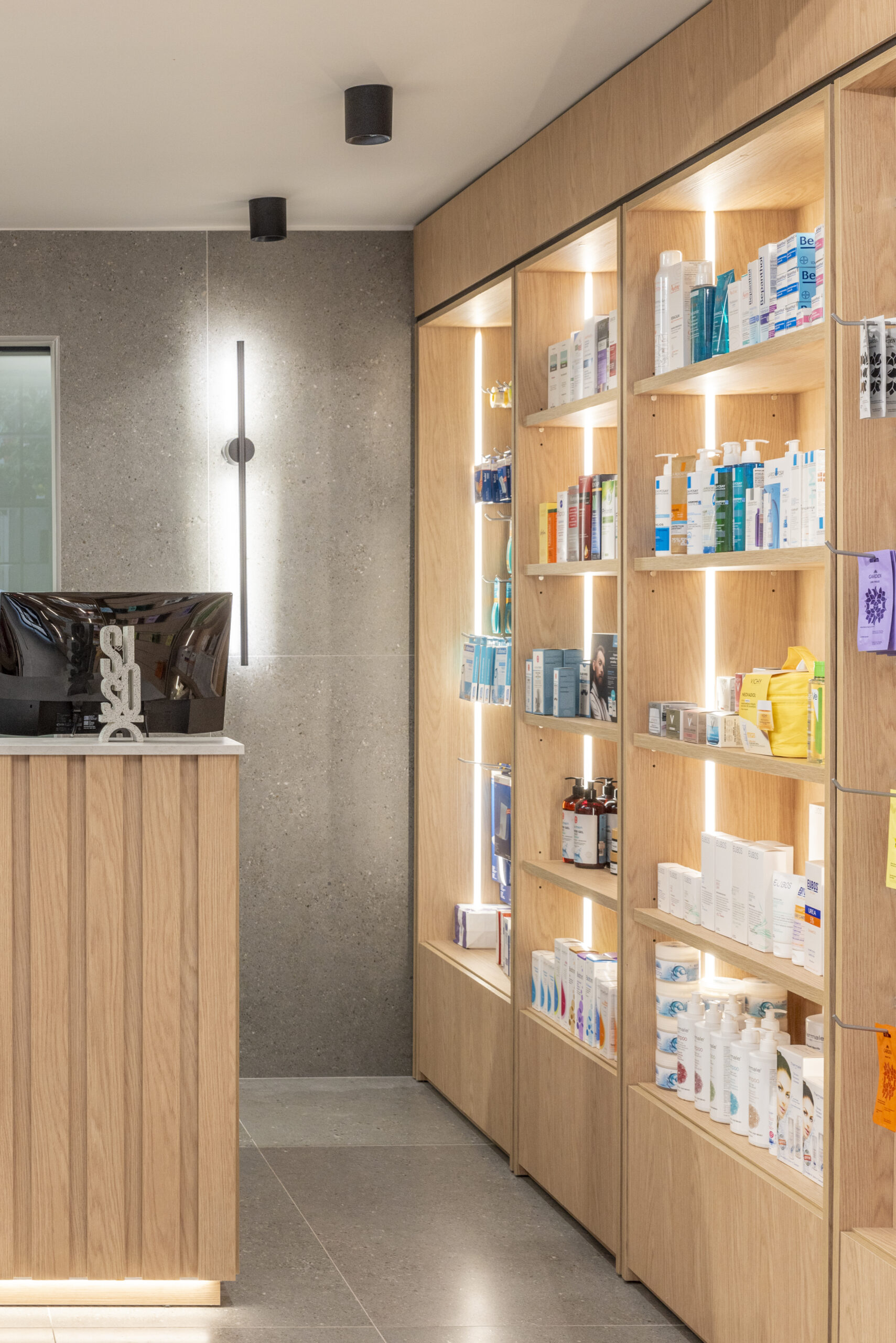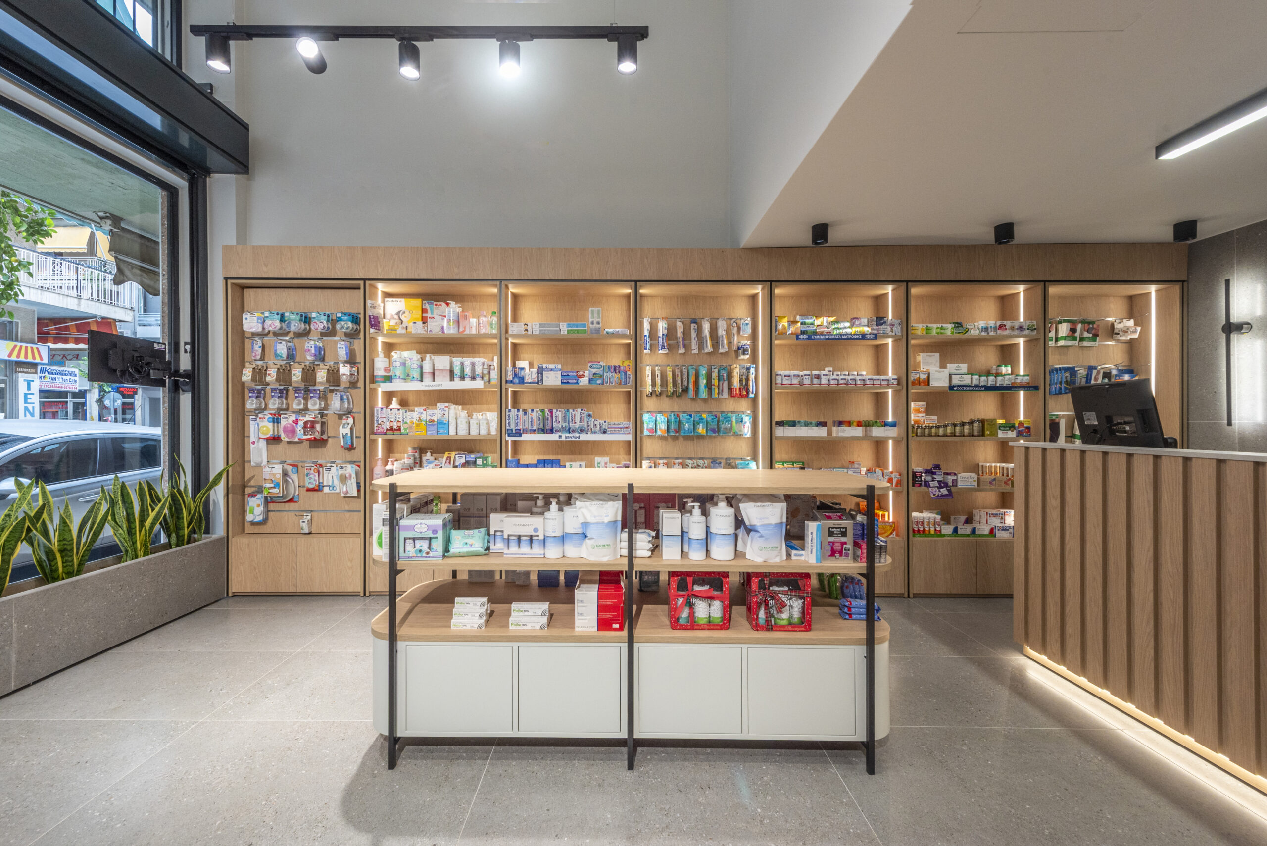 The result is a modern urban pharmacy — clear, timeless, and quietly refined — where architecture supports functionality while elevating the everyday user experience.