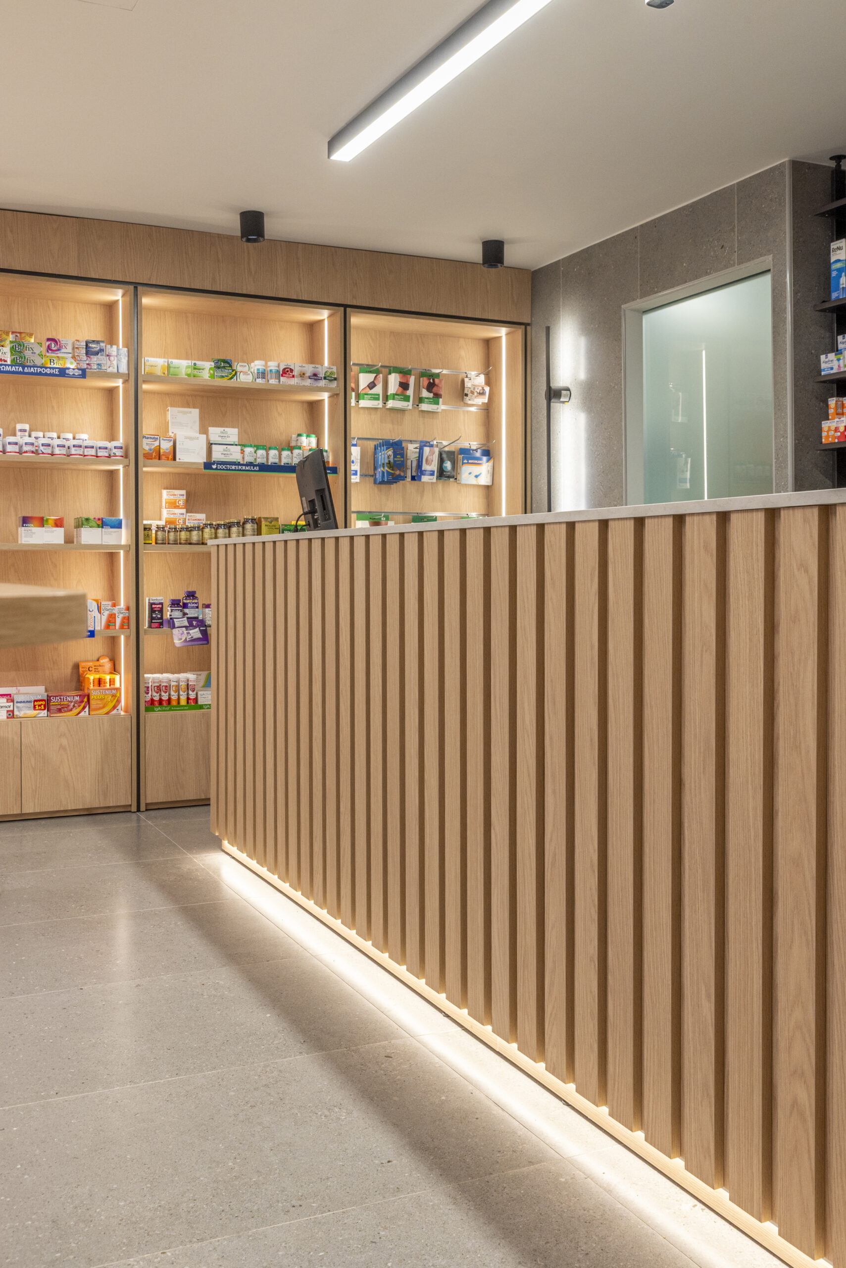 the space is organized around a continuous wooden frame integrates function and shapes the pharmacy’s identity.